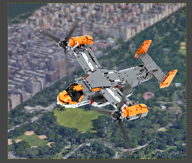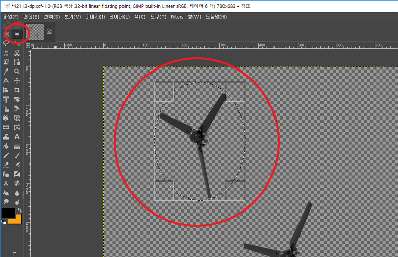 원형 선택 툴을 사용하여, 프로펠러 날개 끄트머리에 맞춰서 타원 모양으로 선택합니다.