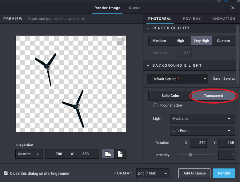 배경을 투명하게 하고, 회전하는 프로펠러만 숨김 설정을 하고 렌더링합니다.