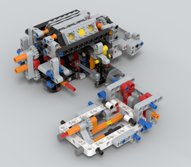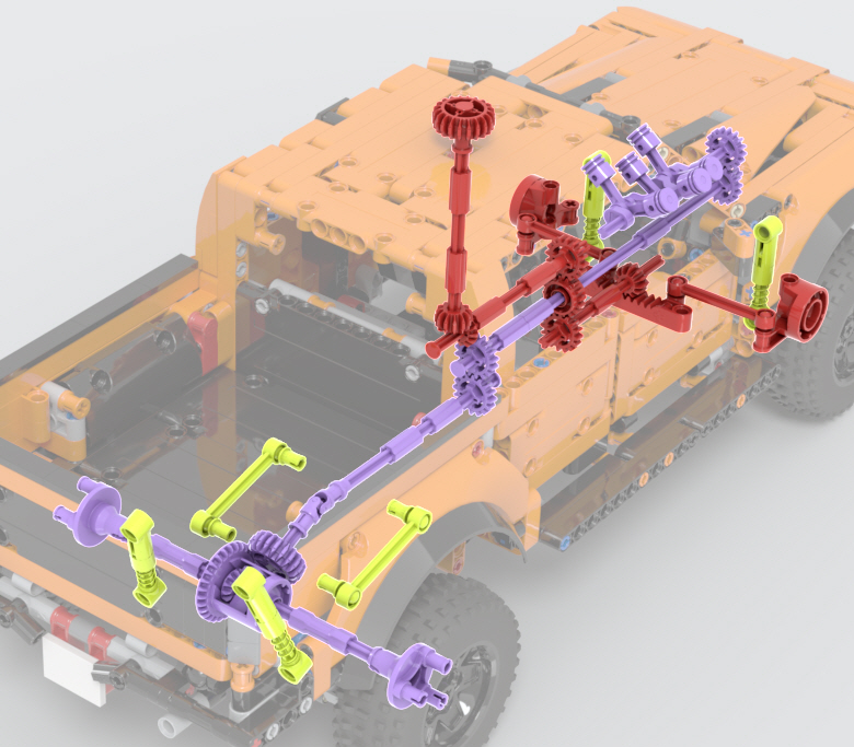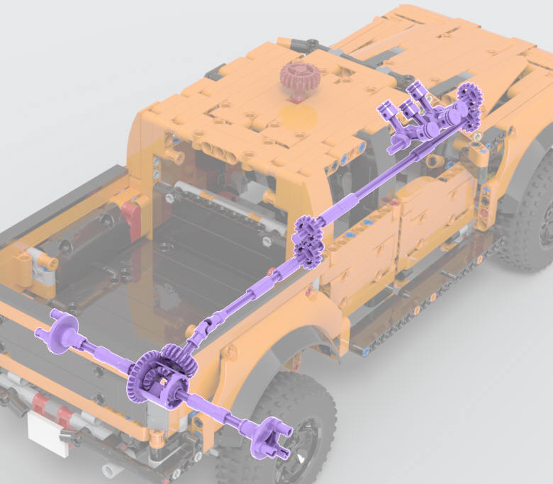 뒤쪽 구동축은 디퍼렌셜 기어가 들어간 큼직한 뭉치를 만들어서,