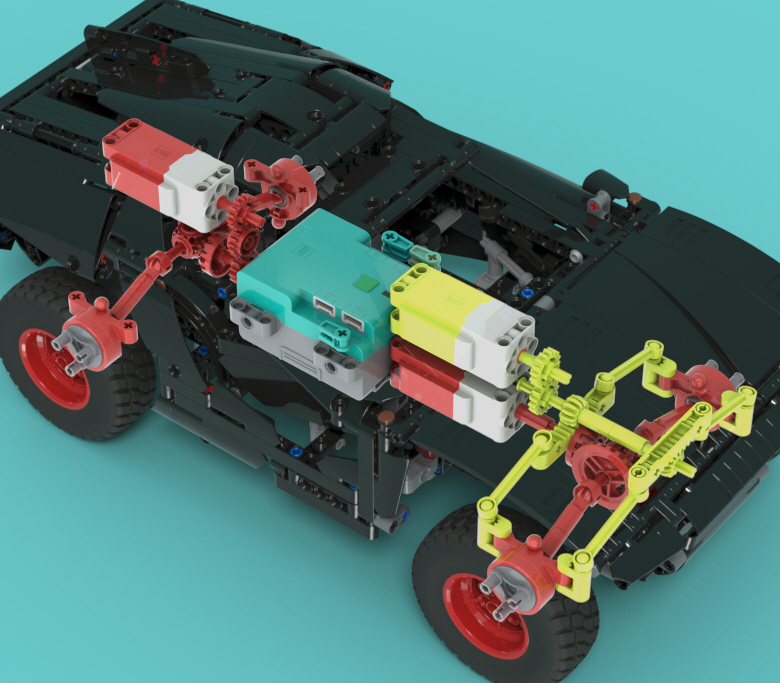 렌더링샷에서는 아직 조립전이지만, 독특하게 조향 기어가 축을 중심으로 앞뒤에 2개 들어갑니다.