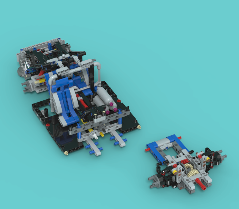 차량 뒤쪽에 있는 레버를 뒤로 당기면, 뒷바퀴 뒤쪽에 있던 브릭 뭉치가 펼쳐지고,