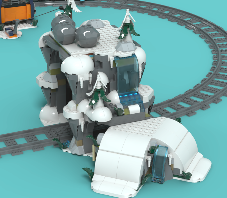 기차가 지나가면 발판을 밟고 지붕이 들리면서 바위가 떨어지는 동굴을 조립하고 있습니다.