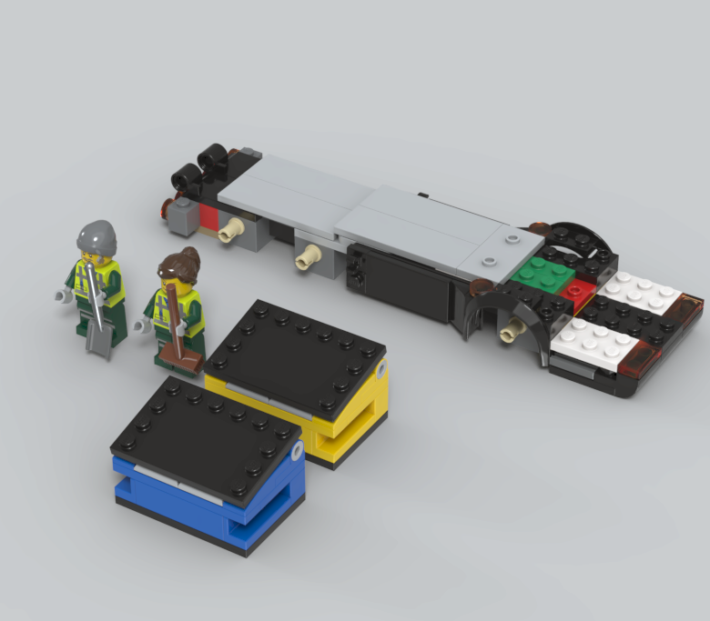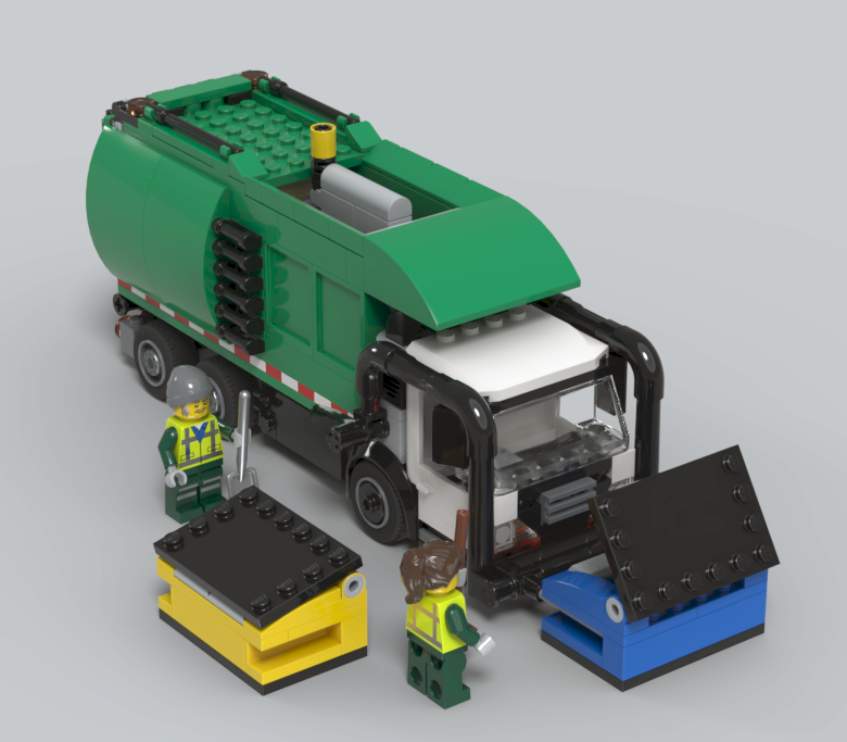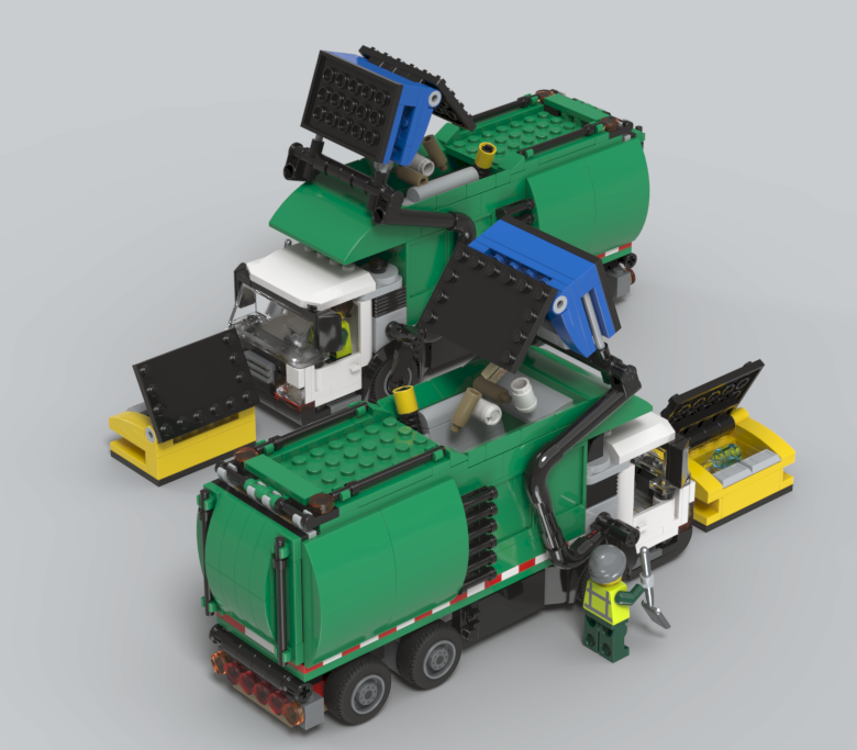 분리통을 만들어서 얹고, 신규브릭인 휠이 달린 바퀴와 쓰레기통 집게까지 붙이면 완성!