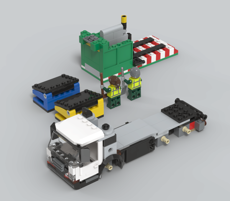 미니피겨 2개, 쓰레기통 2개와 함께 차량을 조립하기 시작했습니다.