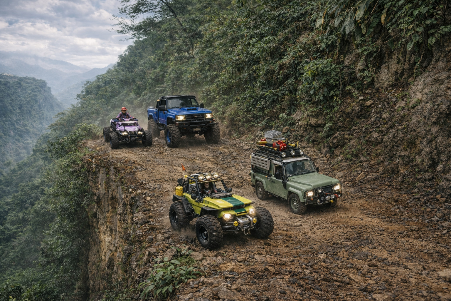 지프형 차량들이 정글속 절벽길을 달리는 모습으로 리터칭해봤습니다.