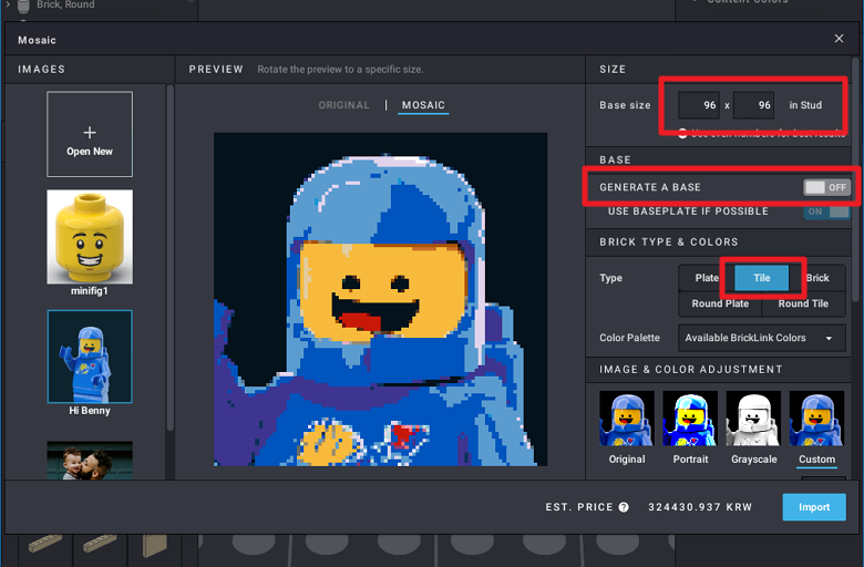 사진을 넣으면 사진에 맞춰서 자동으로 색상과 브릭을 맞춰주는 기능인데요.